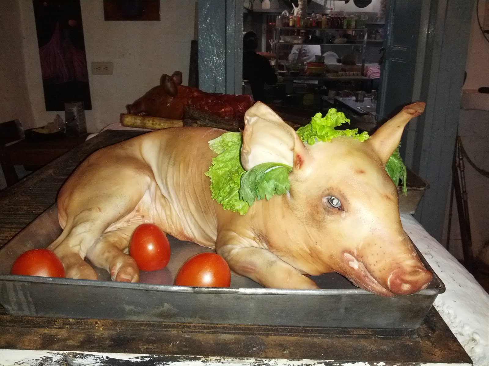 I guess I shouldn’t have been so shocked, being part of an ethnic group that recklessly eats almost everything, and that the turkey is also served in the complete animal form anyway, with the head and neck and the rest.. But it just seems to be a completely different level of dining when it comes to this pig! Even though I am Chinese I found it revolting.. It’s the epitome Lévi-Straussdebate of culture vs nature!! When we eat a baby pig, we Chinese chop the head into half to make it less 3D, less erect and dynamic. We would have removed the eyeball and stuck a maraschino cherry in each socket. In other words, we ‘civilise’ our meat, so it makes us appear less cruel to ourselves (perhaps?).. On the other hand, everything on this pig is left intact, carefully arranged on the baking tray as if the piggy would walk straight into the oven! The ears were still there, gently dangling; and the eyeballs were still glowing, the lashes looked so soft they looked like they would flicker at any time.. This is Lord of the Flies style of omnivore!