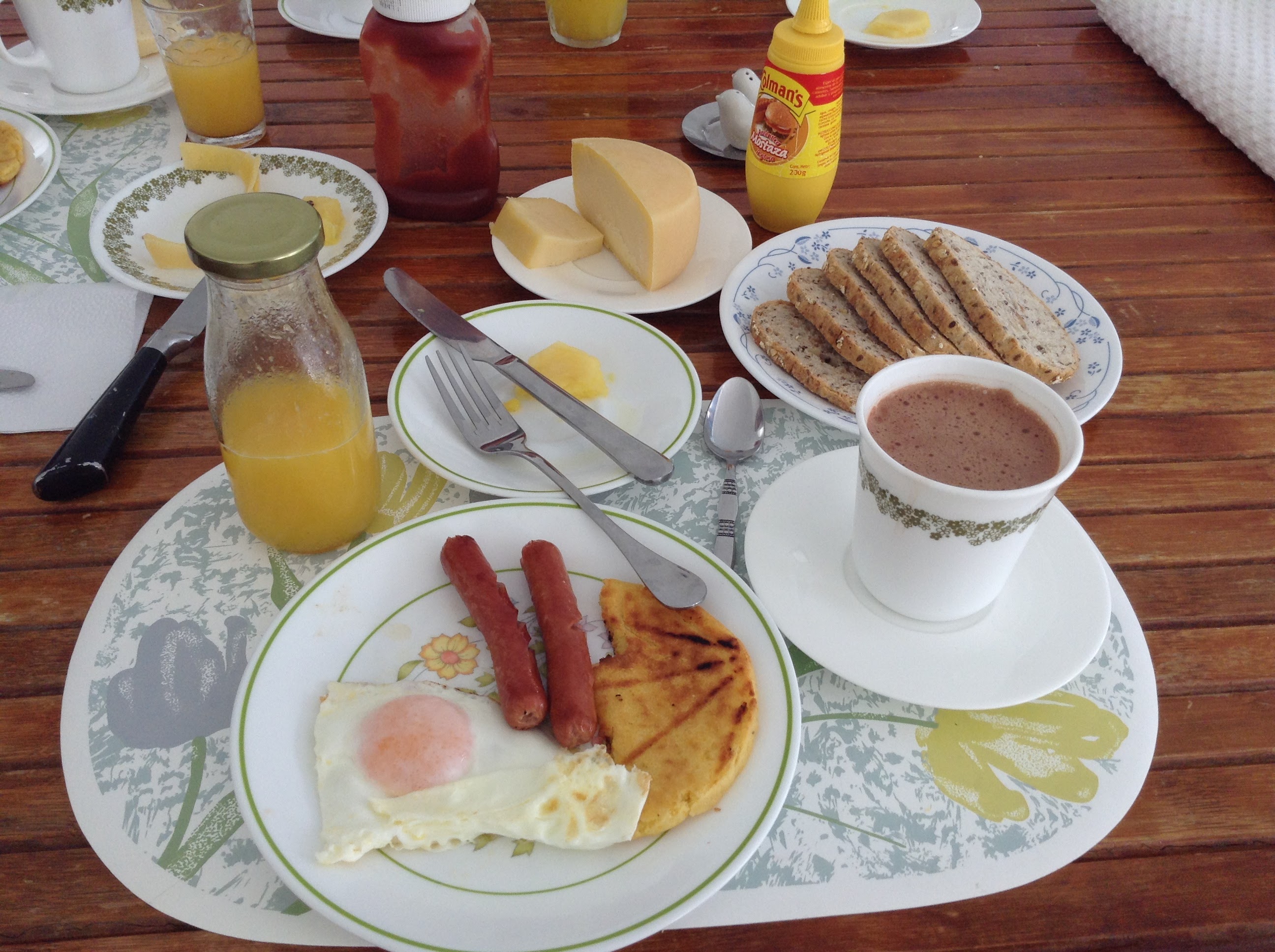 A typical breakfast in Colombia – orange juice, eggs, arepa, hot chocolate, cheese, bread.. Breakfast credit to Martha Salazar.